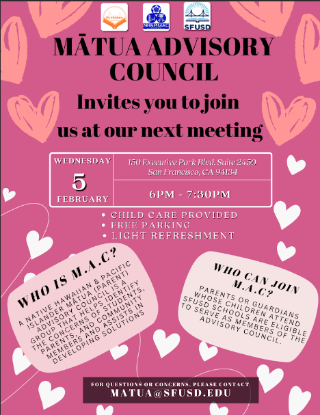 Wednesday, February 5th, 2025, 6pm - 7:30pm. Matua Advisory Council is inviting you and your students (PK-12th graders) to join their General Meeting in person!