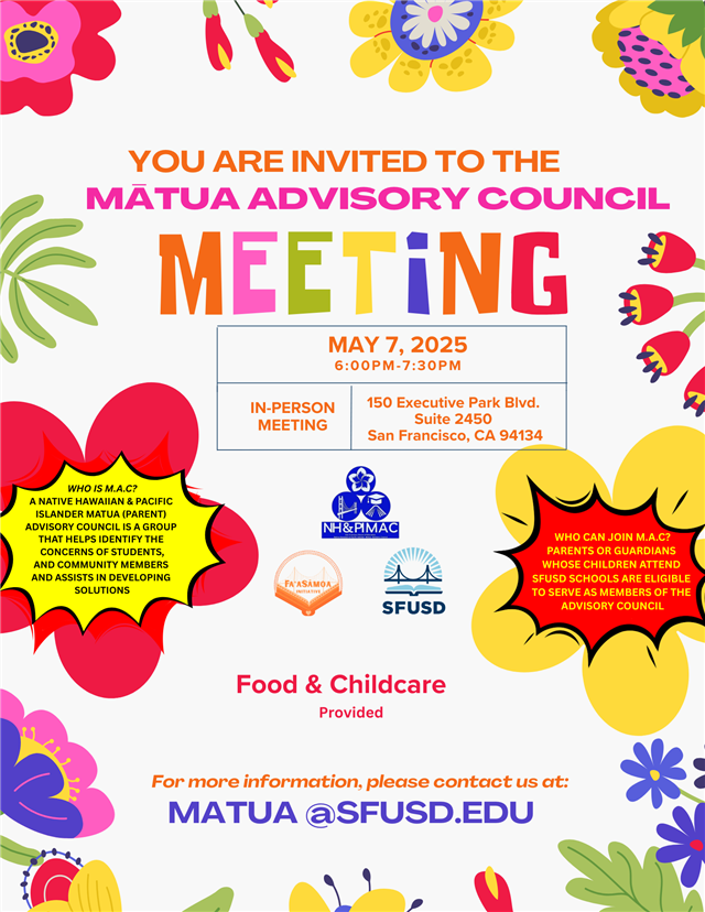 On April 9th, Matua Advisory Council Board met with Superintendent Dr. Maria Su. Dr.Su was able to share updates similar to presentations shared during townhalls and she left plenty of time for answering any questions and concerns from parents/guardians and Pacific Islander community members. Questions asked by Parents/Guardians and Community members covered Special Education Services, Undocumented students, In-school incidents, and staffing. Ms.Tami Beau was able to capture all the questions, and Dr.Su reassured attendees of her priorities in filling classroom teacher vacancies and that the district progressing through addressing 113K budget defict. For updates of the implementation of school district's Fiscal Stabilization Plan visit: www.sfusd.edu/news |