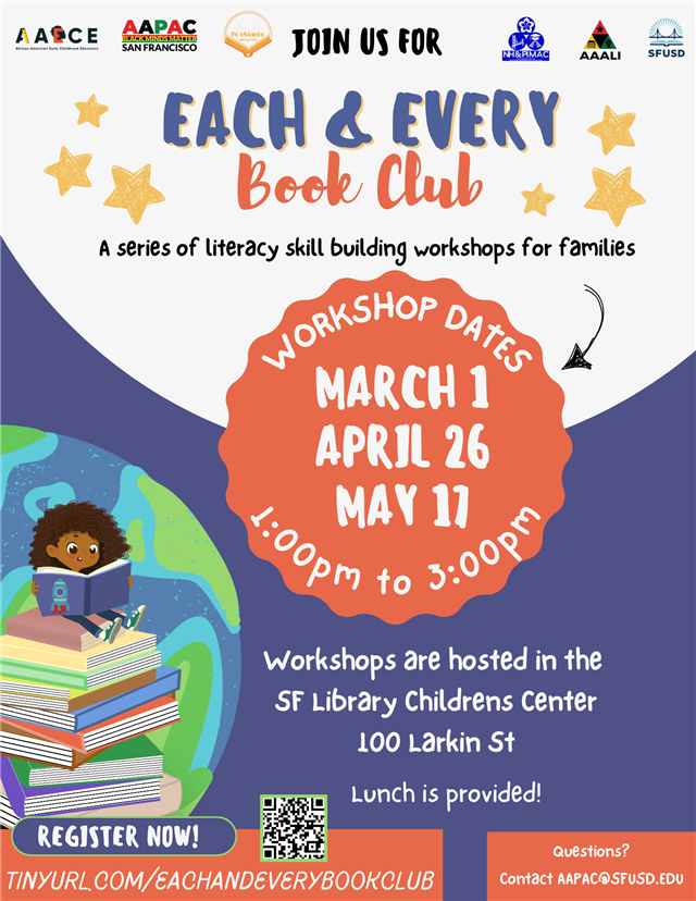 On Saturday, April 26th - Each & Every Book Club held their event of the semester at the SF Main Library Fisher's Children Center, 2nd Floor! This event is part of the promotion of literacy and building literacy skills with family. Facilitated by UrsulaAnn Siataga, 30 students and families learned various languages and how to say Hello or Good Morning! Ms.Siataga did a read-a-loud of the book, Teach Me Samoan: 31 Daily Words by Gerard Aflague. Students then had a chance to choose a book from the bookshelves and bring to Parent/Guardian to read together. Parents/Guardians then were able to color selected coloring templates paper with their children as their child names the colors used. Lunch was provided by Hawaiian Drive-Inn! Thank you AAALI | AAPAC & FASI | MAC for continued and consistent literacy activities in support of our district's literacy goals for our students! A few photos above. |