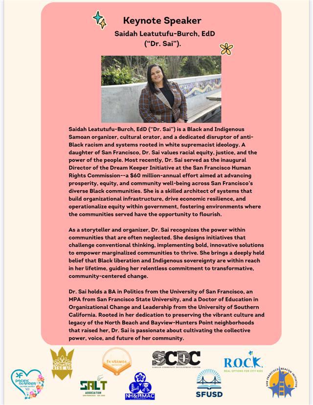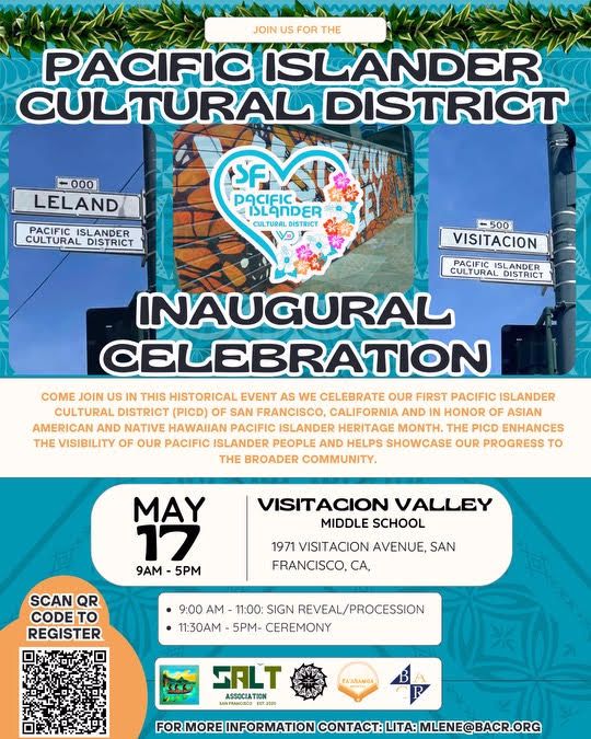 In honor of AANHPI Heritage Month, SFUSD Fa'aSamoa Initiative team is excited to co-sponsor the Pacific Islander Cultural District's inaugural celebration! In partnership with SALT Association, Legacies of the Pacific and Visitacion Valley Middle School, this will be a historical event! Join us during the procession and ceremony! Register using the scan code on the flyer. |