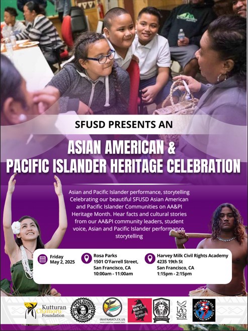 On May 2nd, in honor of AANHPI Heritage Month - Rosa Parks ES & Harvey Milk Civil Rights Academy will be hosting and celebrating with students and staff with cultural stories, performances and storytelling! Flyer for more information on times of events at each school site! Shout out to Verna Castro, Meri Veavea and Glenn Castro for coordinating these events! |