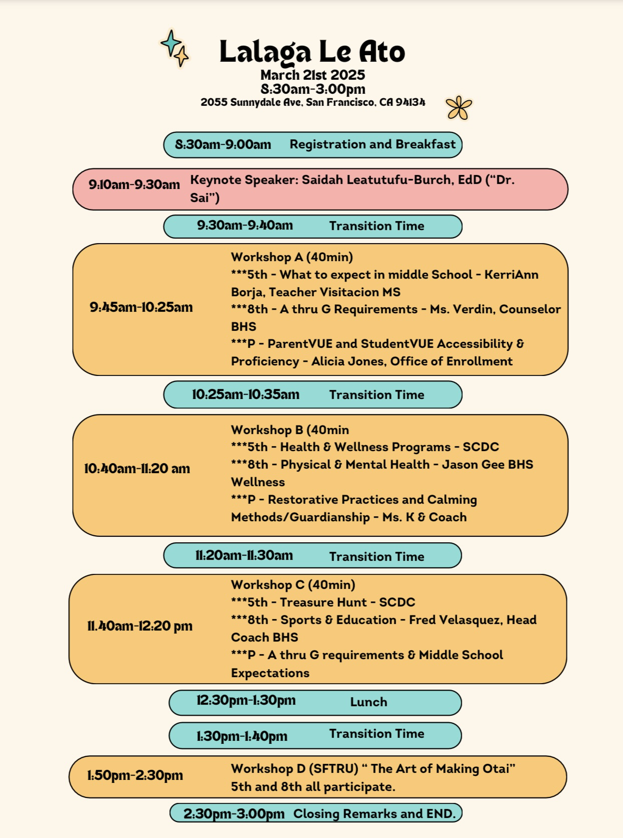 On March 21 was the 2nd Annual Lalaga Le Ato (Weaving the Basket) Summit. This event provides workshops for rising 6th and 9th graders and their parents/guardians as they prepare for the next level grade. Keynote speaker was Dr.Saidah Leatutufu-Burch, EdD and workshops facilitators included KerriAnn Borja, Visitacion Valley, Ms.Verdin, Balboa HS, Jason Gee, Balboa HS, SCDC, Coach Fred and Alicia Jones from Enrollment. Check out the agenda, keynote speaker biography and a few photos of the day above! Big Shout outs to all Community Based Organizations, School Sites and Afterschool programs who have sponsored and participated! Shout outs to all the School Site Chaperones who brought the students to event! Thank you Dr.Pettiford, Erica D, Coach Wylie from Office of Access & Equity Team for a successful event! |
