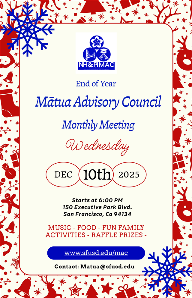 On December 10th, 2025, Mātua Advisory Council (MAC) had their last General Meeting of the year! This meeting was hosted by Street Violence Intervention Program, Elder Joe Kaulave. Our special guest, Lizzie Liu, Parent & Community Coordinator in SFUSD Student Nutrition Services Division. She presented on plans to be intentional of parent and community feedback as they plan for ways they can improve student nutrition services for students and getting accurate information directly to our families. She posed in photo next too the grand prize created/dontated by Beacon afterschool program at Bret Harte Elementary, Mrs.Merita Kaulave and her amazing team! Other prizes were dontated by SF Tongans Rise Up and SALT Association. Thank you Parents/Guardians and community for your commitment to collective efforts in partnership for our future generations. |
