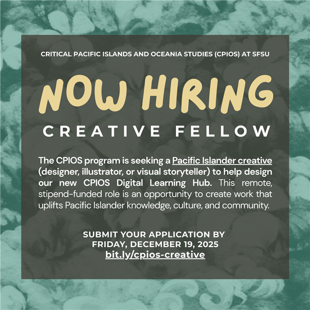 Critical Pacific Islander & Oceania Studies program (CPIOS) is seeking a designer, illustrator, or visual storyteller to help design our new CPIOS Digial Learning Hub. This remote, stipend-funded role is an opportunity to create work that uplifts Pacific Islander knowledge, culture, and community. Submit your application by Friday, December 19th. Click on the link below. |