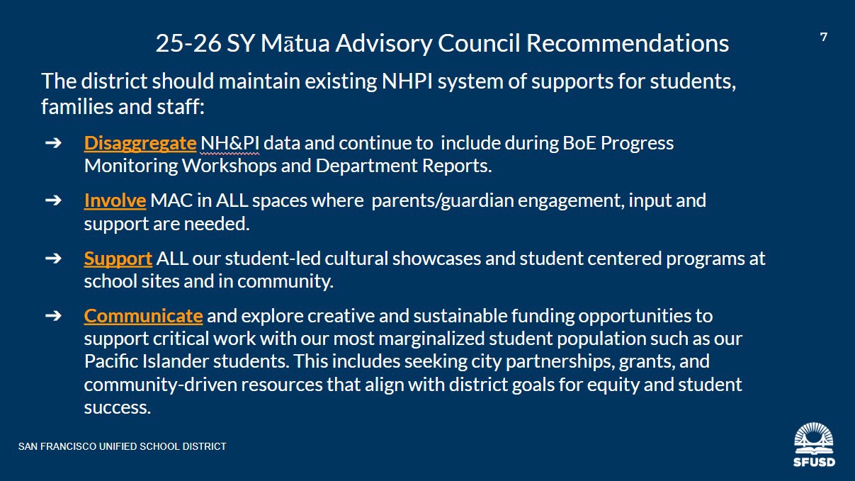 On December 9, 2025, Mātua Advisory Council (MAC) representatives & Fa'aSamoa Initiative Team presented to the SFUSD Board of Education. Their presentation included highlights, history, MAC recommendations and shared an example of process and strategy with Literacy. Their Brightspots looked at positive gains and data shifts in Literacy with NHPI students and sharing partnerships with MAC, School Sites, Community-based organizations and Afterschool programs who have all aligned their efforts to tackle SFUSD Goal 1: 3rd grade literacy. The presentation was met with positive comments and questions from Board Commissioners to Dr.Su around sustainability and supports for initiative, ways to model efforts district-wide, and even ways to continue a legacy starting with first Pacific Islander/Samoan elected Board Commissioner member, Faauuga Moliga and community advocacy since 2018. For the full presentation slides, visit www.sfusd.edu/fasi. To find recorded 12/9 SFUSD School Board Meeting, https://www.youtube.com/watch?v=nbyGqInJh18 [MAC presentation starts at 1:38:00. |