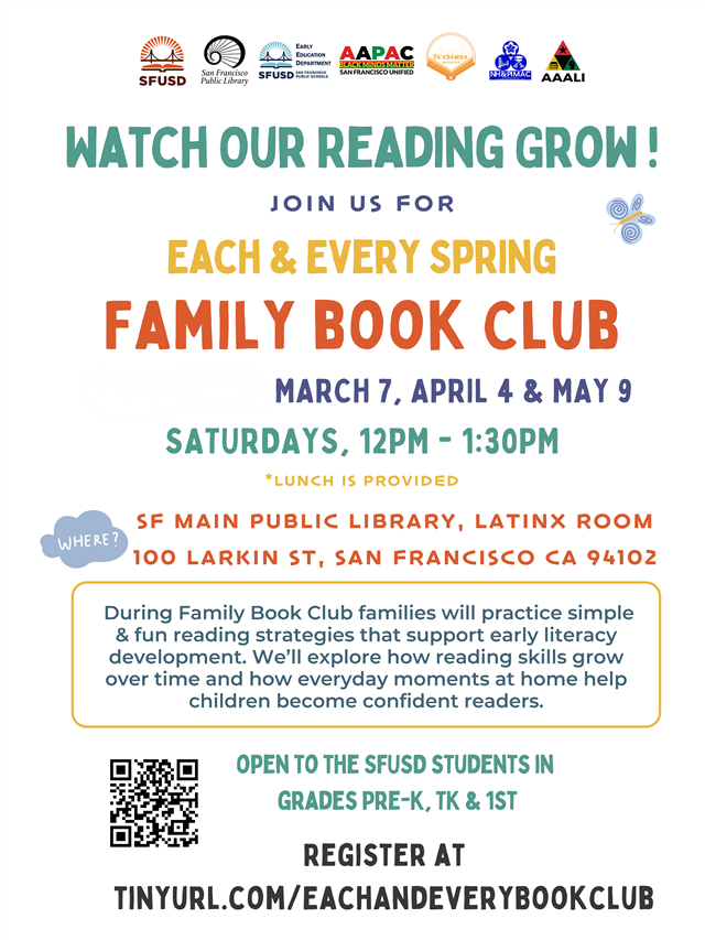 During Family Book Club families will practice simple & fun reading strategies that support early literacy development. We'll explore how reading skills grow over time and how everyday moments at home help children become confident readers.