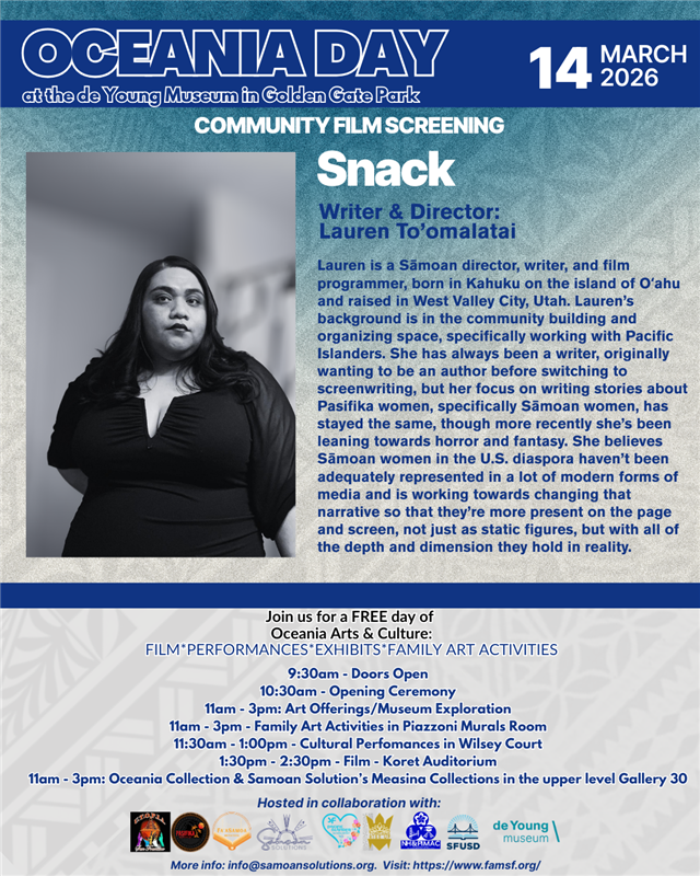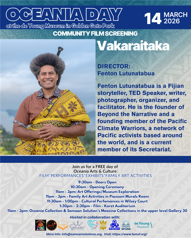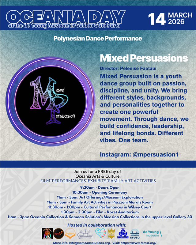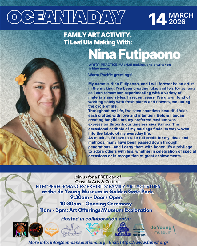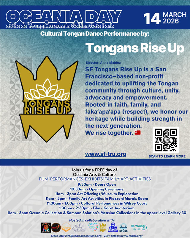 This event is made possible through the collaborative efforts of: De Young Museum, Pasifika By Design, Tongans Rise Up, Fa'asamoa Initiative & Matua Advisory Council of SFUSD, Utopia SF Bay Area & Samoan Solutions.