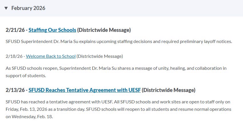 These are a few important SFUSD updates in February, and click button below for more information and messages from Superintendent's messages to SFUSD Community. Stay informed. |